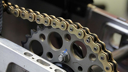 Most often, the power is conveyed by a roller chain, known as the drive chain or transmission chain, passing over a sprocket gear, with the teeth of the gear meshing with the holes in the links of the chain. The gear is turned, and this pulls the chain putting mechanical force into the system.